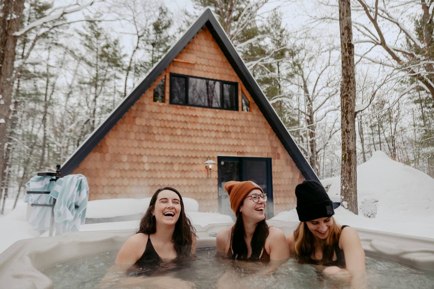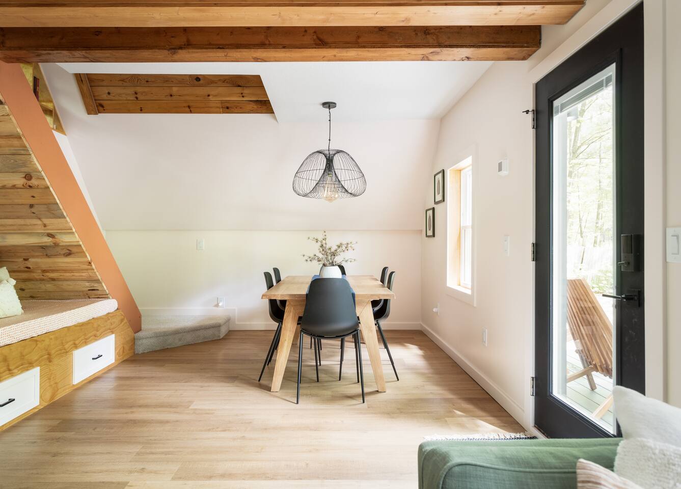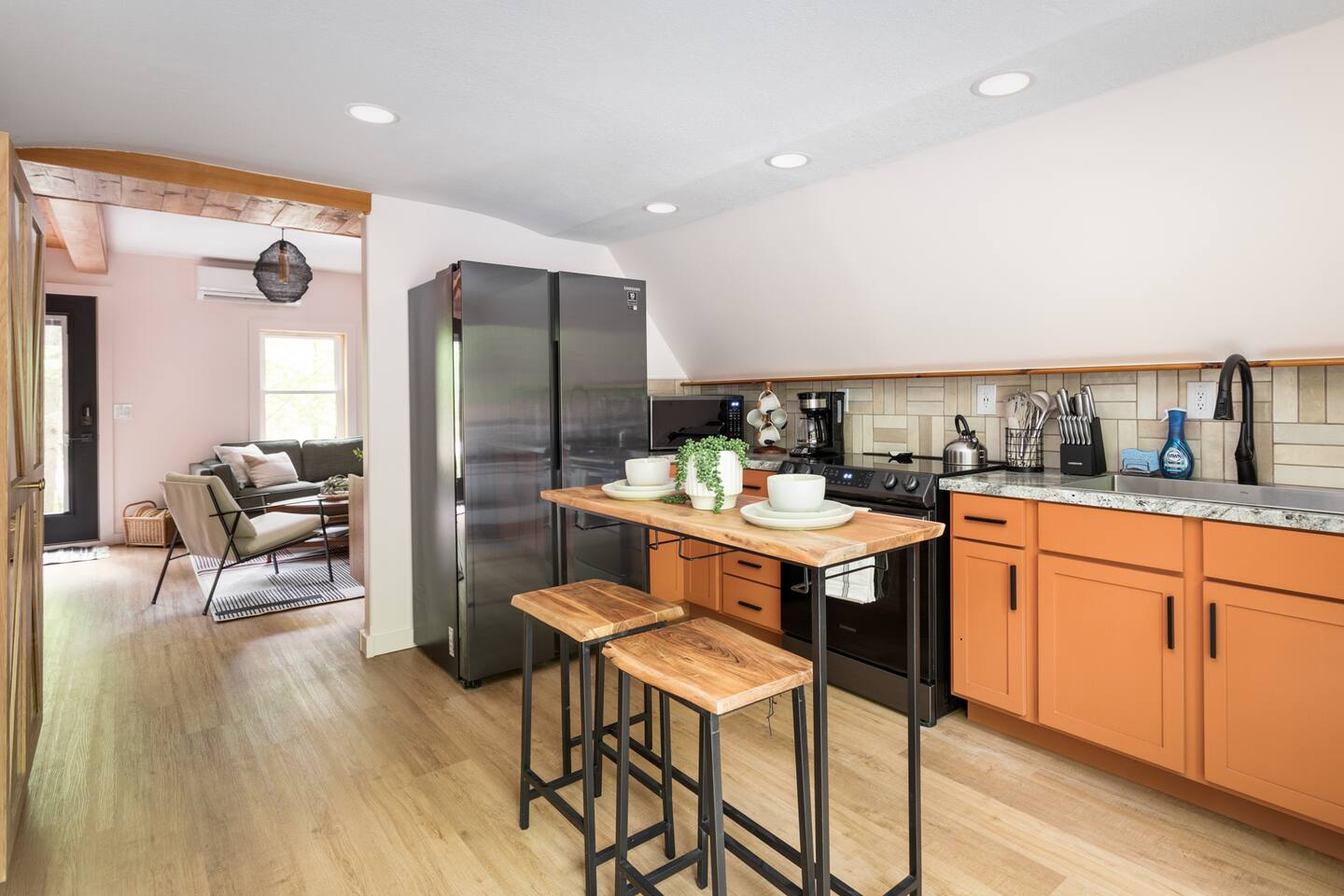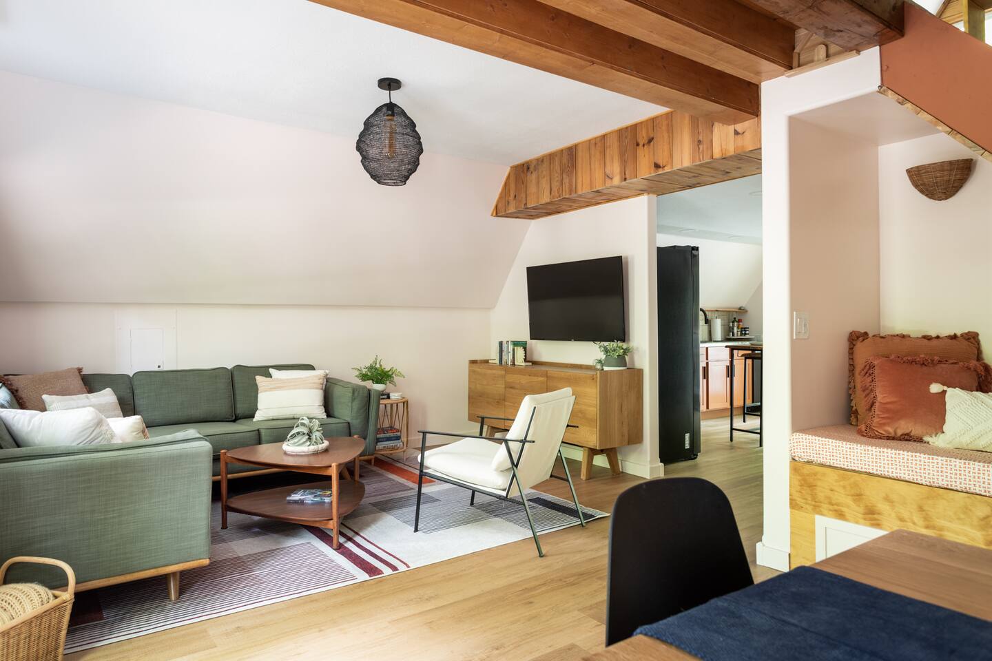 Welcome to our charming A-frame cabin, a stylish and comfortable getaway we renovated from the ground up. The space is designed for relaxation and comfortably accommodates up to four guests. // Sleeping Arrangements: - Main Bedroom: Luxurious king-size bed, TV, and a sound machine for a restful night. - Loft: Two cozy built-in twin beds, also equipped with a sound machine. // Living & Amenities: - Living Area: Cozy space to relax on the main floor. - Kitchen: Fully equipped with a dishwasher, coffee maker, and everything needed for meal preparation. - Bathroom: Stylish design with a double vanity. - Laundry: In-unit washer and dryer for your convenience. - Climate Control: Mini-split heating and air conditioning for year-round comfort. // Family-Friendly Features: - Pack 'n Play - Children's books, toys, and dinnerware // Outdoor Oasis: - Expansive deck with a large, private outdoor space. - Year-round hot tub. - Firepit for evening gatherings. - Charcoal grill for outdoor cooking.