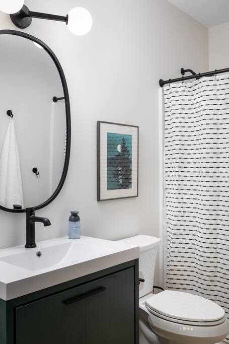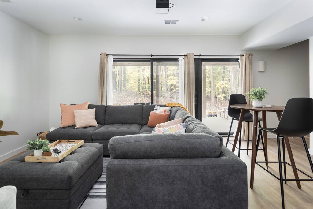 This inviting two-story residence is complete with a spacious full basement. The upper level features two cozy bedrooms, a well-appointed bathroom, and a charming mini-living area, all complemented by a delightful outdoor birds-nest deck offering serene wooded views. On the main level, you'll discover a generously sized kitchen and living area, a well-equipped bathroom, a coffee bar, and an impressive, sprawling deck perfect for gatherings. Notably, the kitchen boasts a unique feature—the entire oven doubles as an air fryer! In the basement, you'll find laundry facilities, an additional bedroom, and a high-definition projector ready to transform your movie nights into cinematic experiences, complete with a popcorn corner for that authentic theater feel. Outside, you'll find the perfect space to unwind, featuring a grand fire pit with comfortable seating and a new cedar sauna for you to enjoy. For your convenience, a Level 2 charging station with a J1772 plug is also installed for guests with electric vehicles.