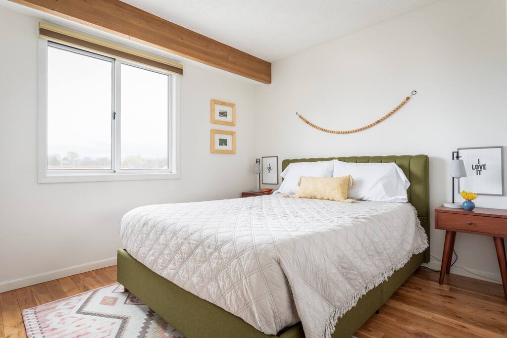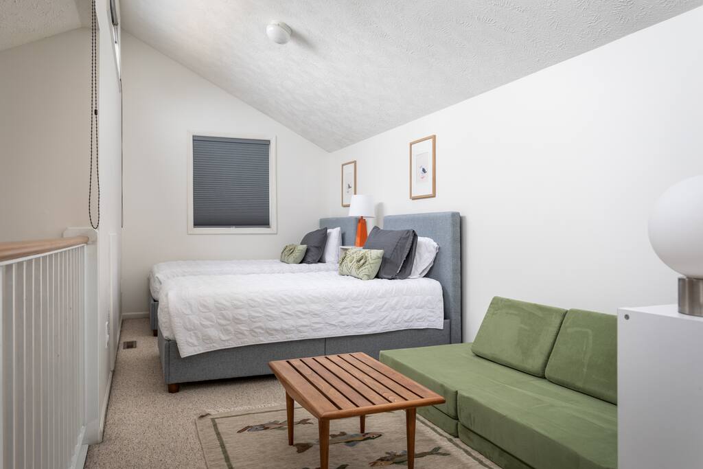 Rest comfortably in two bedrooms, each with a queen bed, plus a sleeping loft with two twin beds, complete with provided bed linens and bath towels. The full-size kitchen is well-stocked and includes spices, condiments, pots, and pans for your cooking convenience. An in-unit washer and dryer are available with the essential supplies. One dedicated parking spot is available in the garage, with space for another vehicle right behind it. Street parking is also available in the summer months.